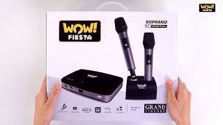 WOW Fiesta Soprano 10 Digital box contains the main unit, two (2) digital wireless microphones with stand, song list, remote control, HDMI and RCA cables, AAA batteries, power adapter, free USB and a carrying bag.